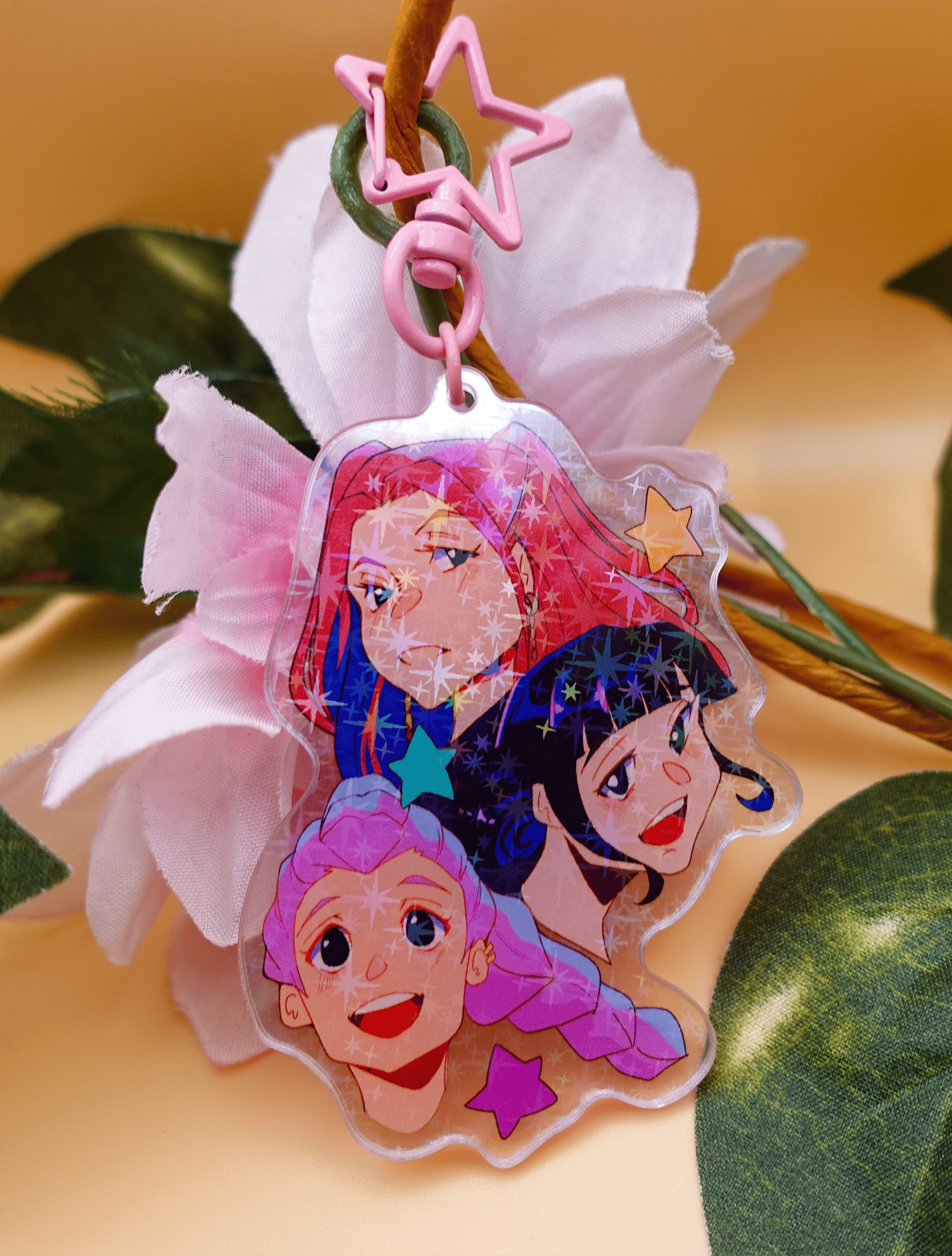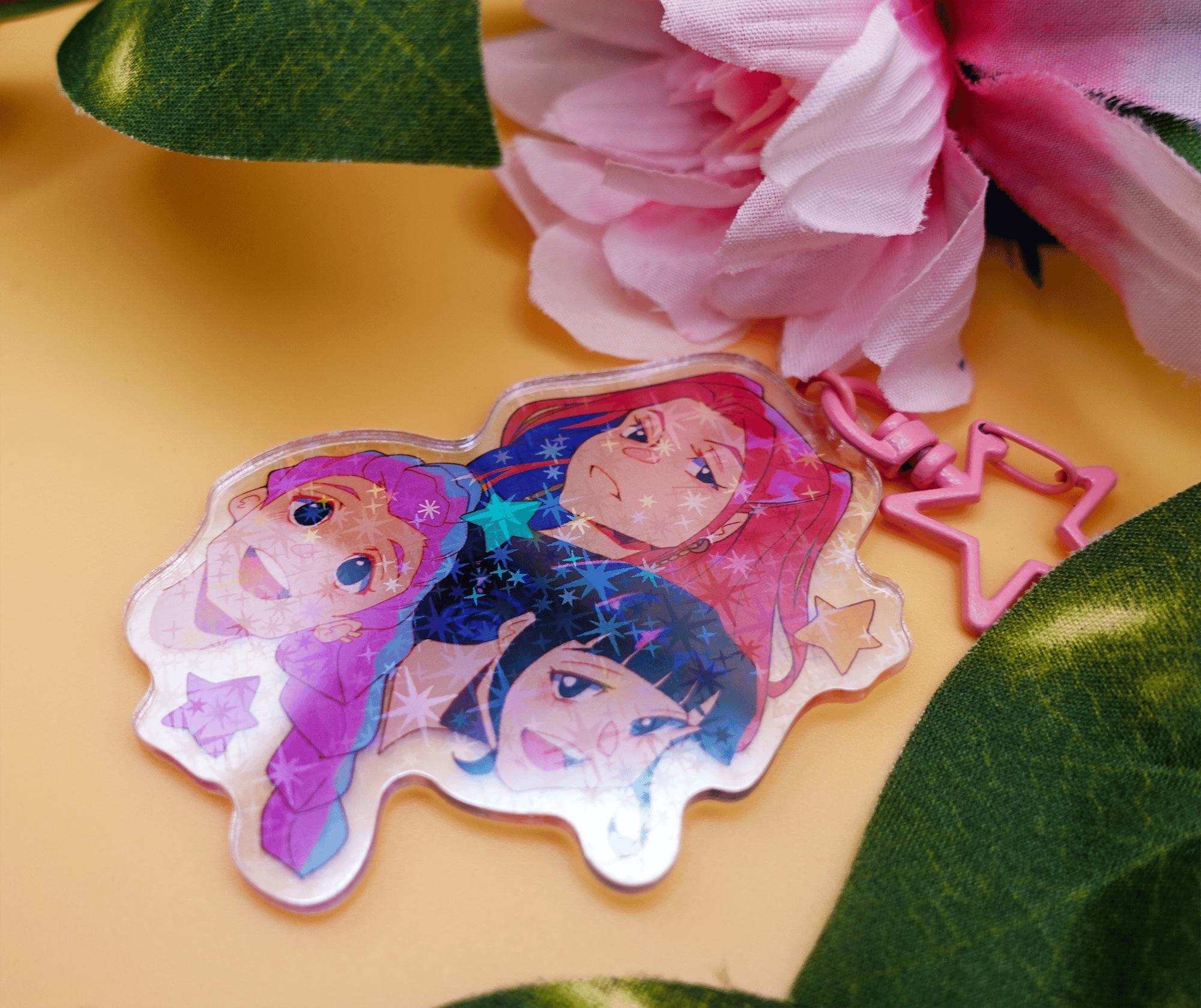 Printed on glossy, durable acrylic with crisp, vibrant colors, it’s the perfect accessory for keychains, bags, phone straps, and backpacks. Whether you’re drawn to stunning character art, stylish outfits, or the mix of glitter and grit, this charm brings bold personality wherever you go.